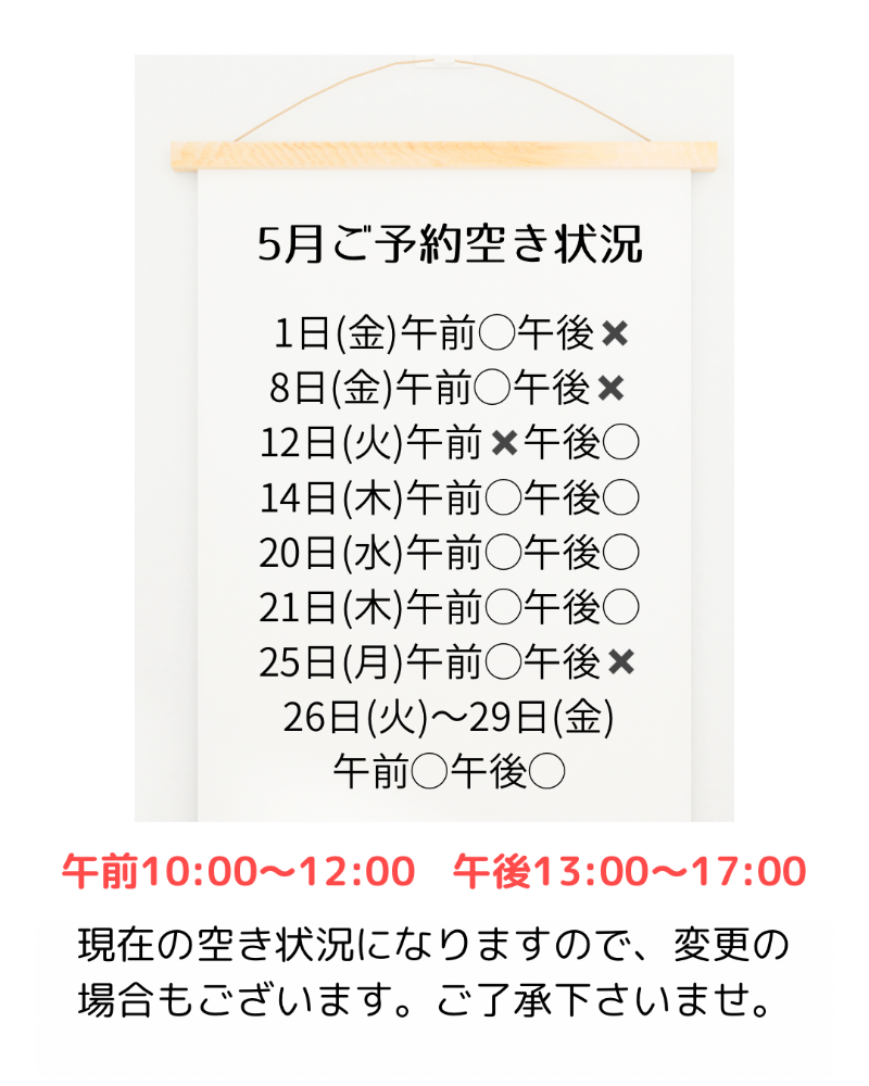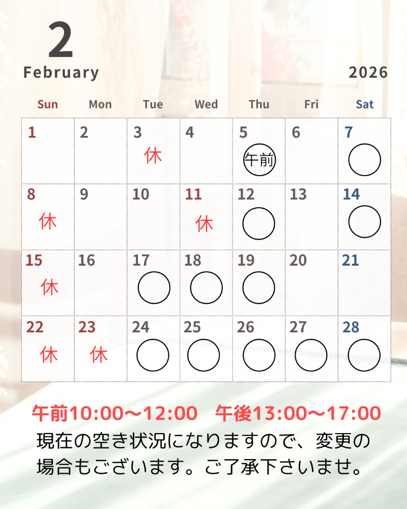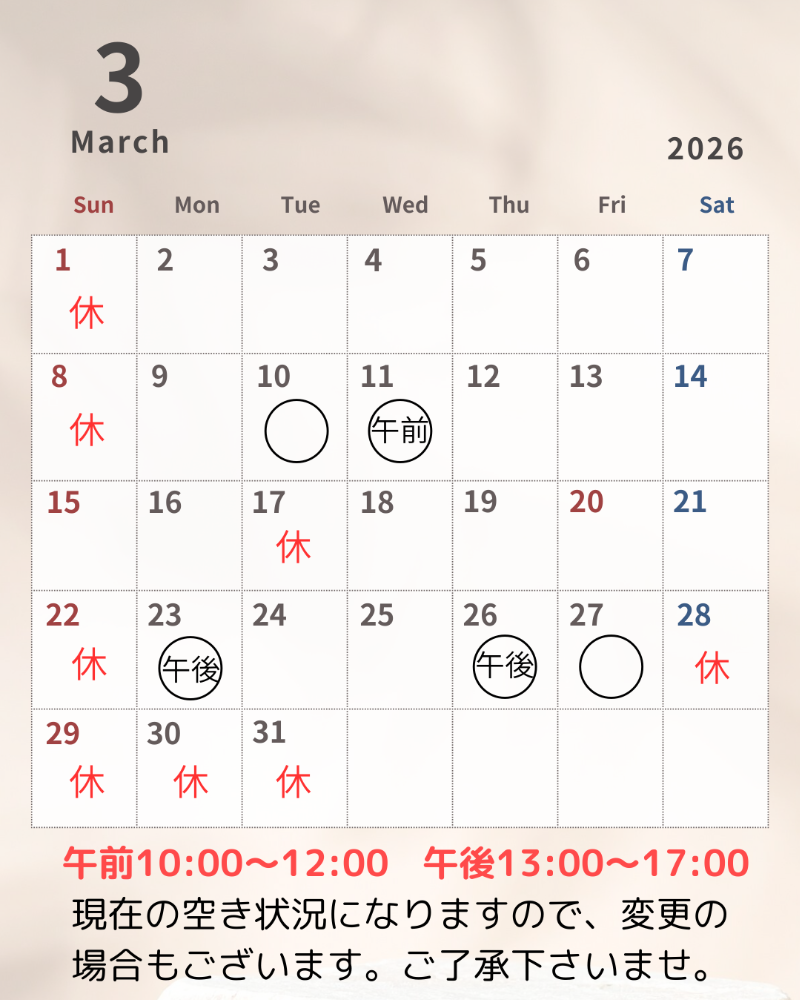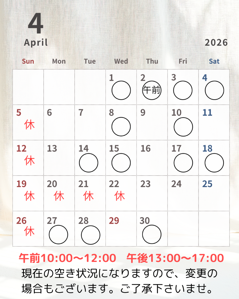| 営業時間 | AM 10:00〜12:00 PM 13:00〜17:00 (最終受付16時) 日、祝日、年末年始はお休みです |